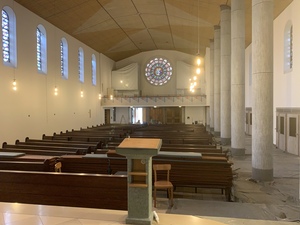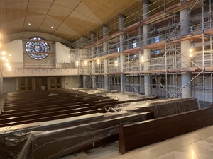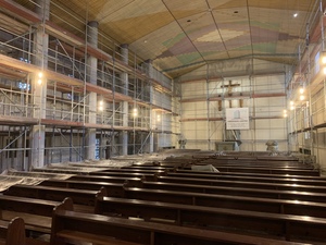 Eingerüstete Kirche \"Zur Hl. Familie\" mit Blick zur Orgelbühne. - Foto (c) Dunker